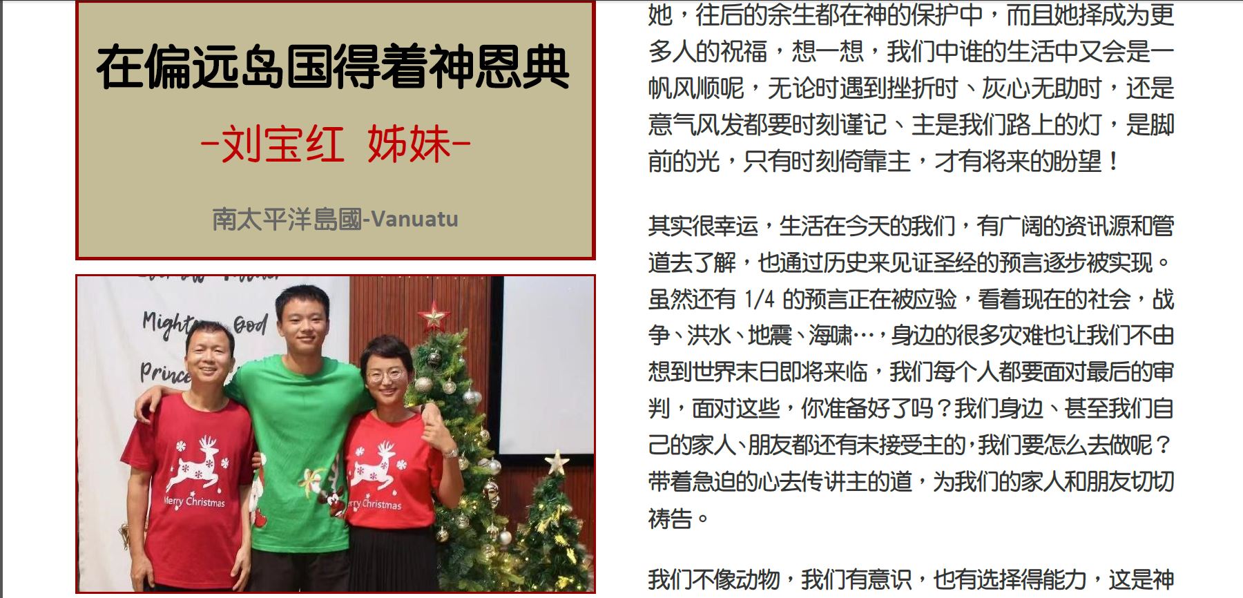 因著懷相無遠弗屆的一對一對課能力,實體一對一可以,視訊一對一也行,遠在南太平洋島國瓦努阿圖Vanuatu-劉寶紅姊妹,也透過新西蘭北岸希望之光教會的Ester姐妹,全程耐心、認真對課,走過十課旅程。劉寶紅姊妹見證說,2017年信主後,雖然跟著不同牧師學習,但從沒有把聖經完整讀過一遍,對聖經框架結構也不是很清楚。有時讀經學習,只明白字面意思,很難串連各個章節、時間點跟預表,更難明白主透過聖經傳達的意思,很多時候總是問,「怎樣我才能聽到主對我講話」、「怎麼才能更加靠近主!」